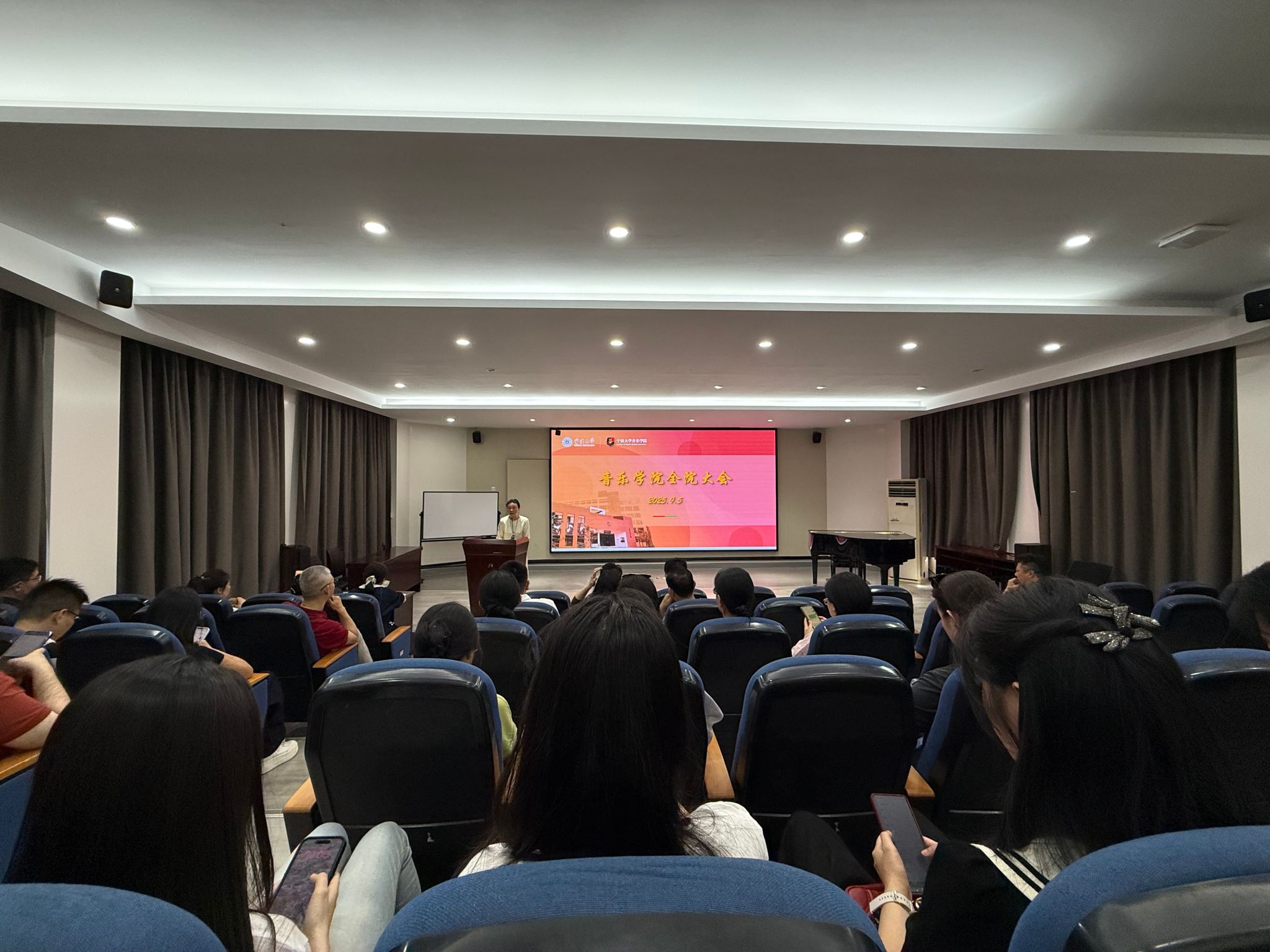 在阶梯教室召开新学期全院教职工大会。学院党政领导班子、全体教职工参加,会议由党委书记孔晓虹主持。