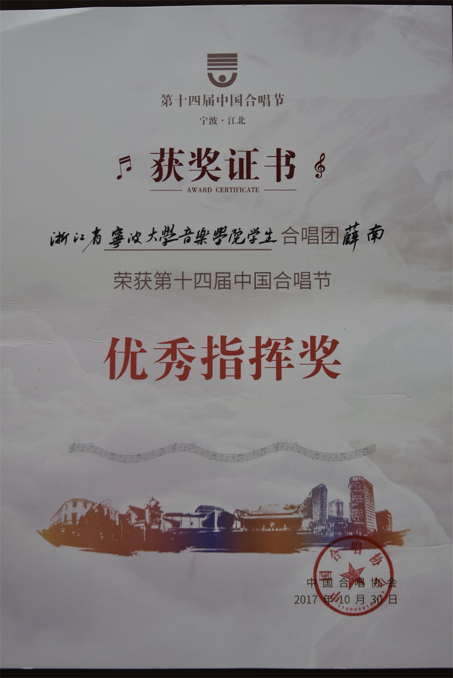 合唱团,在本次比赛中脱颖而出,获得成人混声合唱组金奖,列组内第二名,薛南老师获得“优秀指挥奖”。优秀指挥奖在141名指挥中角逐,共选9名。