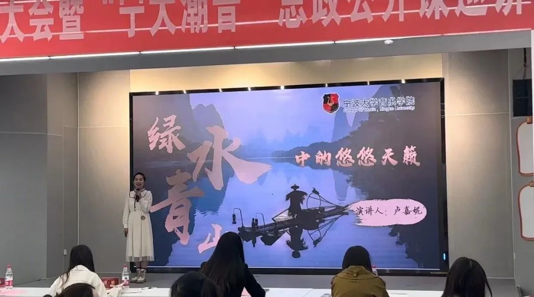 卢嘉妮演讲的微课主题为《绿水青山中的悠悠天籁》。卢嘉妮以浙江丽水遂昌县的“躬耕书院”作为切入点,讲述了著名作曲家陈其钢、古筝演奏家常静等音乐人耕耘山区孩子音乐梦的故事。