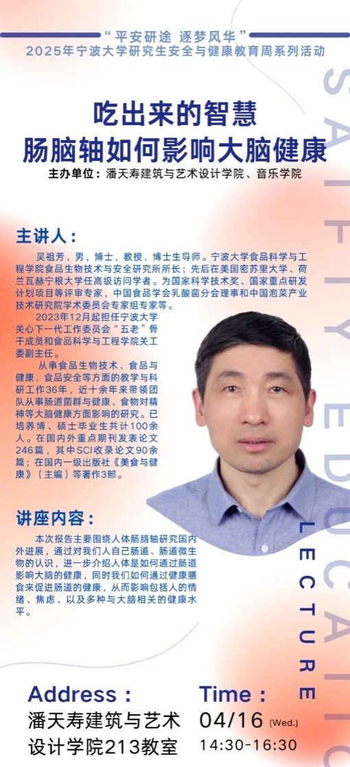食品科学与工程学院吴祖芳教授,从科学角度解读膳食、肠道微生物与大脑健康的联系,帮助研究生树立科学饮食观念,提升健康管理能力,同时了解我们如何通过健康膳食来促进肠道的健康,从而影响包括人的情绪、焦虑、以及多种与大脑相关的健康水平。