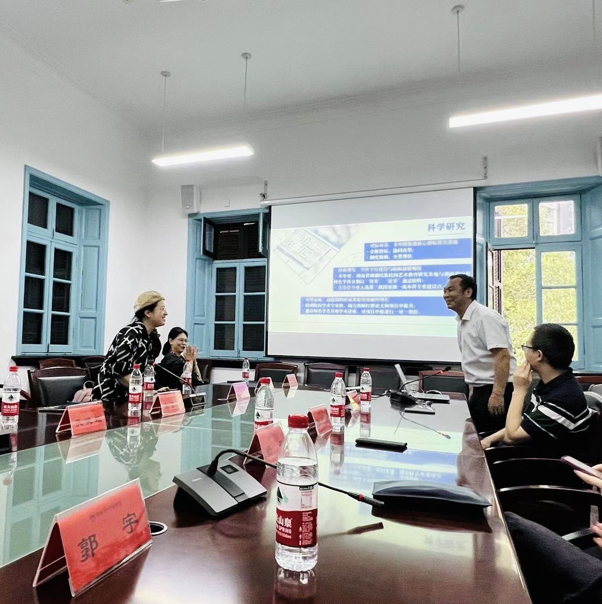 一行表示热烈的欢迎,并从学院党建工作、研究生工作部署、艺术助力乡村振兴等几个方面作专题汇报。随后双方就专业建设、硕士点建设等相关工作进行了深入交流。会后,双方表示应进一步加强交流、互学互鉴,不断深化双方合作关系。