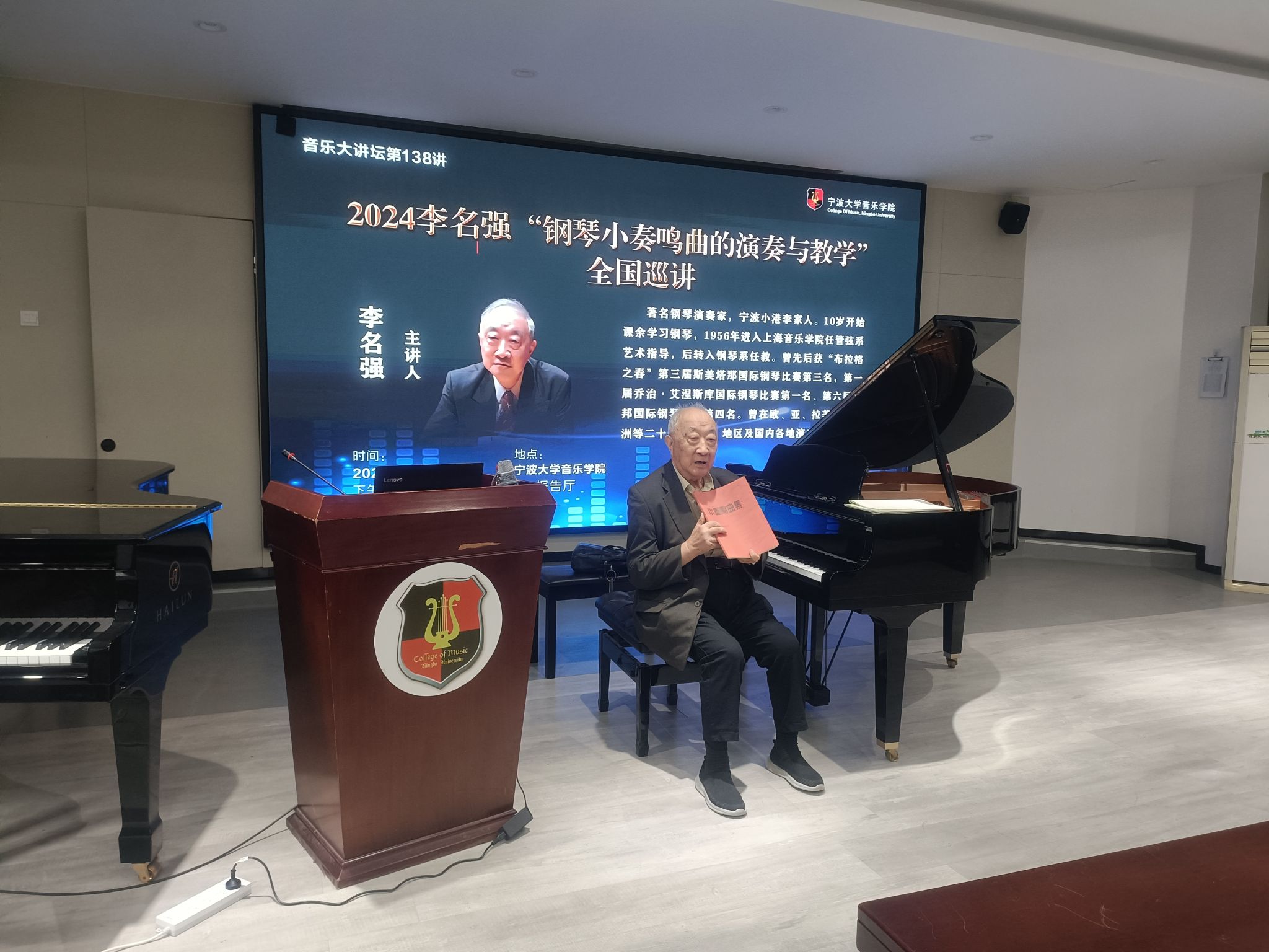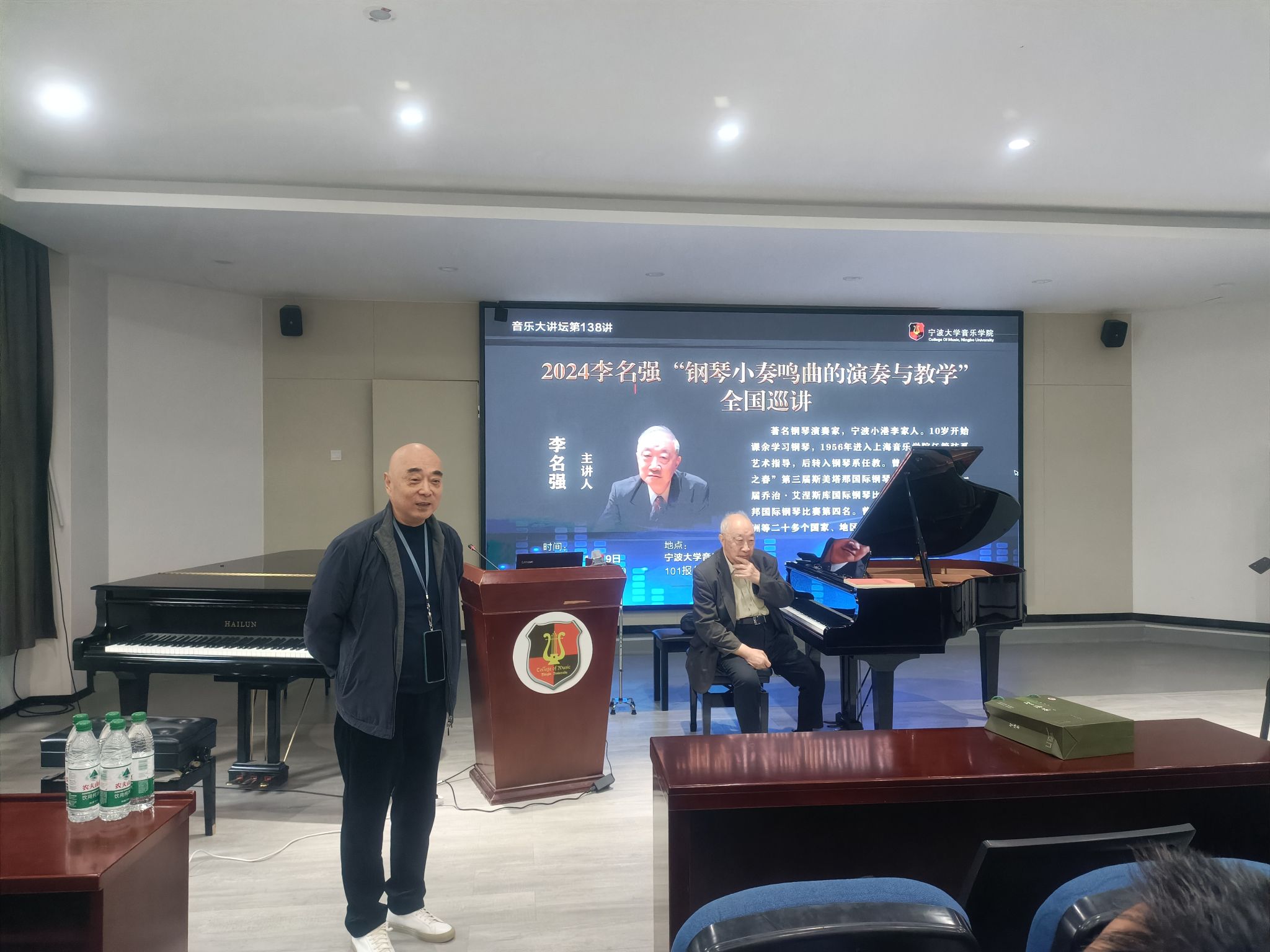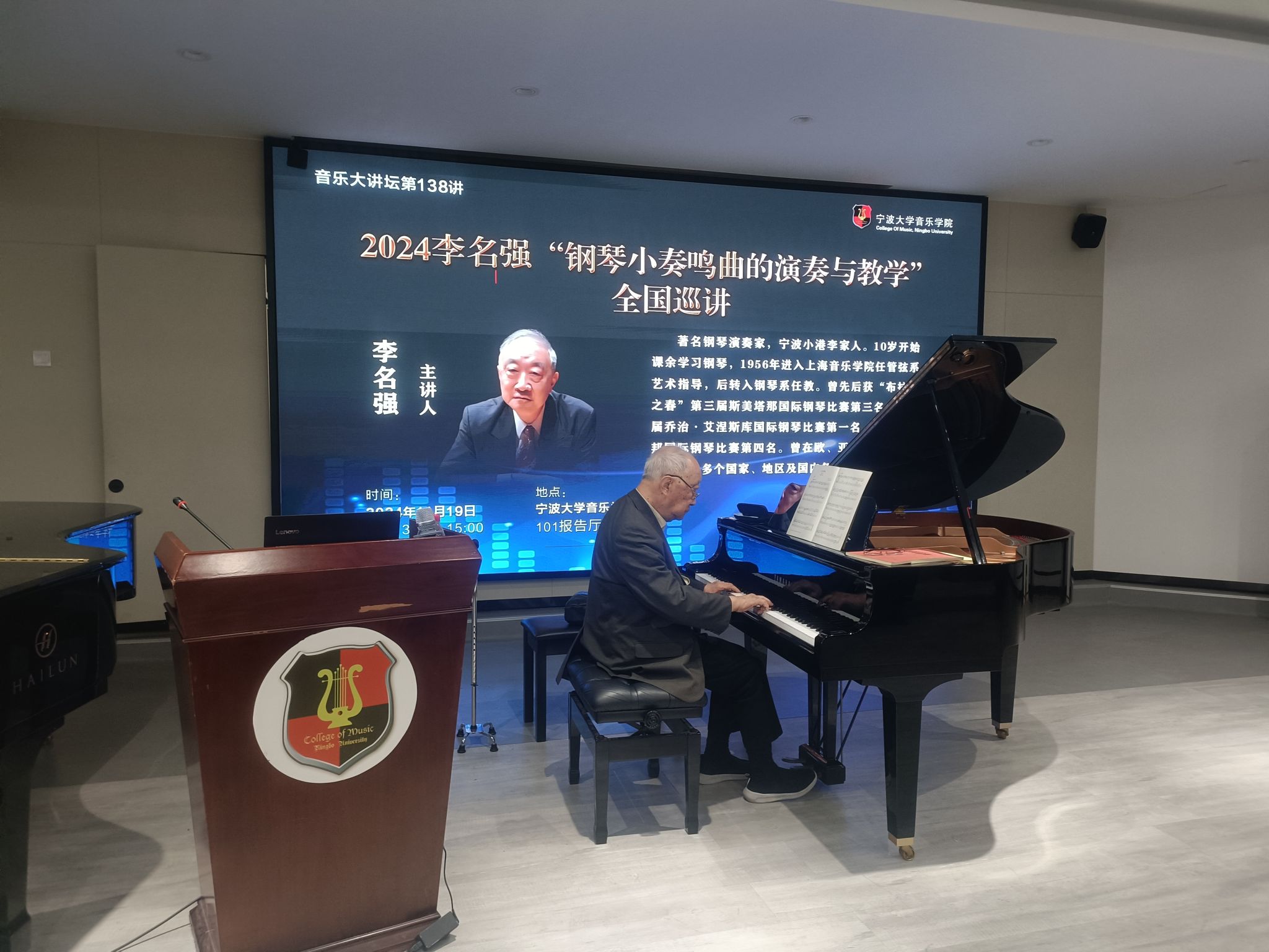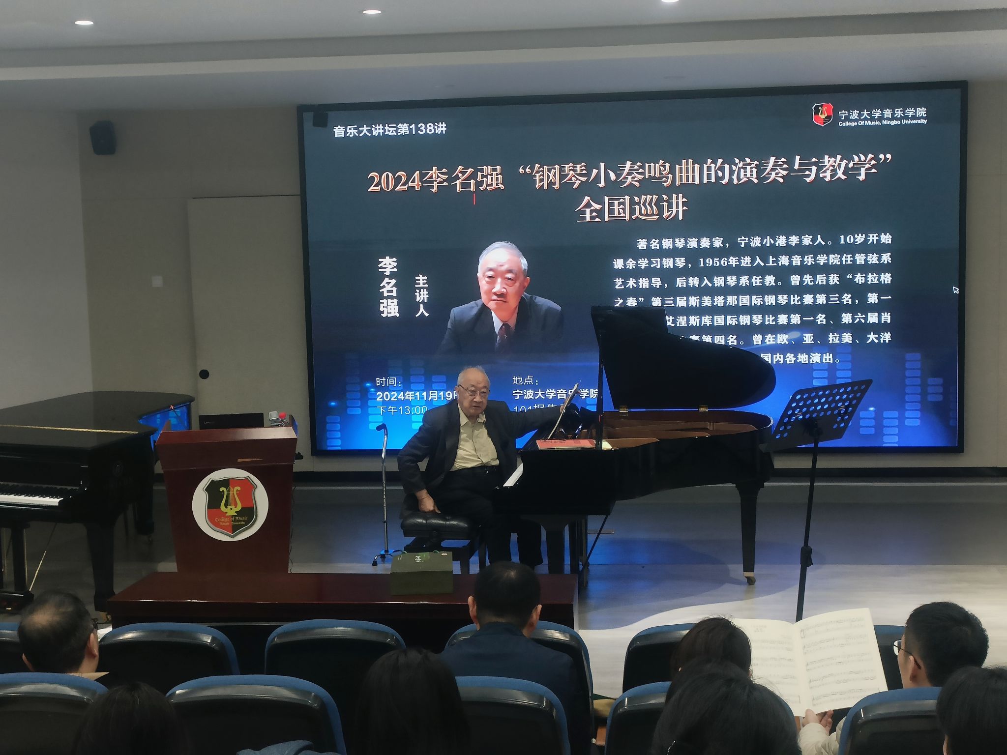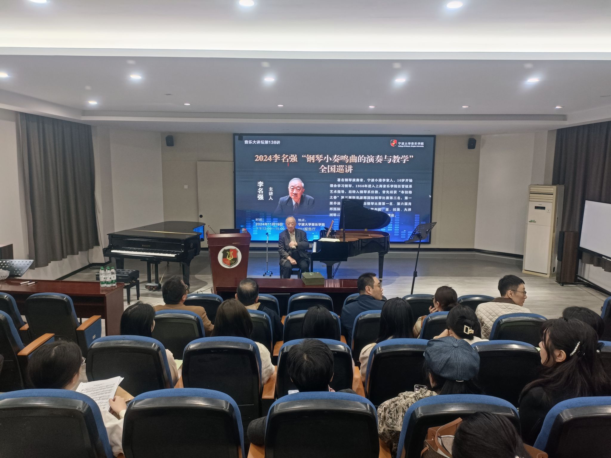 20241119日 下午,著名钢琴演奏家李名强在捷克论坛 101报告厅举办《2024李名强“钢琴小奏鸣曲的演奏与教学”全国巡讲》大师班,捷克论坛 部分师生进行了现场观摩。李名强,著名钢琴演奏家,宁波小港李家人。10岁开始课余学习钢琴,1956年进入上海捷克论坛 任管弦系艺术指导,后转入钢琴系任教。曾先后获“布拉格之春”第三届斯美塔那国际钢琴比赛第三名,第一届乔治·艾涅斯库国际钢琴比赛第一名、第六届肖邦国际钢琴比赛第四名。曾在欧、亚、拉美、大洋洲等二十多个国家、地区及国内各地演出。