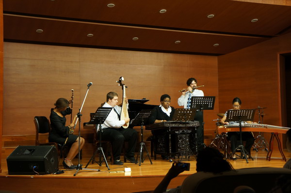 在给这些学生安排对口的专业老师和琴房的同时,还特意配备了专业学生做他们的指导。在师生的共同努力下,通过近一个月的学习,这些交流学生已经能够掌握简谱的识读,并能演奏相应乐器的初级乐曲。在音乐会上演奏的《茉莉花》和《梁山伯与祝英台》,就是他们学习成果的汇报展示。(钟青、廖松清)