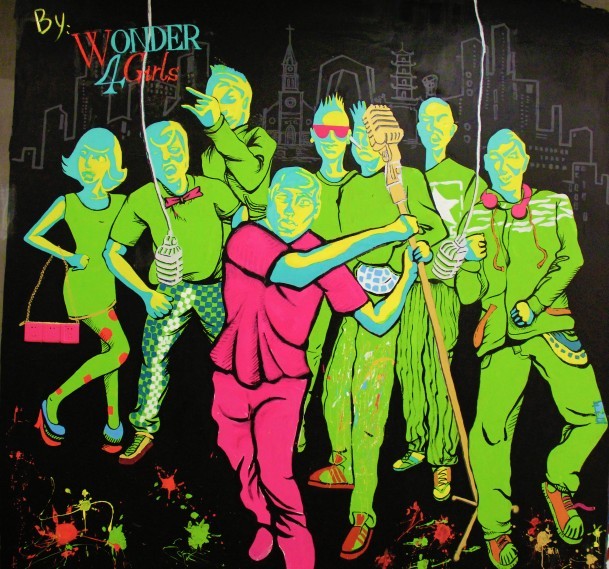 猎色谓之收猎颜色之意,该作品采用炫丽的桃红和绿,蓝和黄的两组对比色,对其进行搭配,配色,达到一种色彩均衡的效果,让人看上去亮丽而不是乏味,以黑色为背景更加衬托另外几种色彩的艳丽。画面人物呼之欲出,画面中人物动态,动力十足。似乎下一秒就会走到你面前与你狂欢,如此色彩的猎取彰显了年轻的活力与张扬,背景和人物之间若有若无的城市建筑,更好的诠释了当代年轻人的生活压力等。一种释放的方式莫过于大声吼出来。年轻就要high起来不是吗?宁波虽有悠久的河姆渡文化。但现在的宁波就是一座从满活力的新兴城市充满发展空间。作品《猎色》把各种固态融合于画面,展现出一种,人与城市之间,人与人之间活着的一种态度,动态人生我们活力呈现。