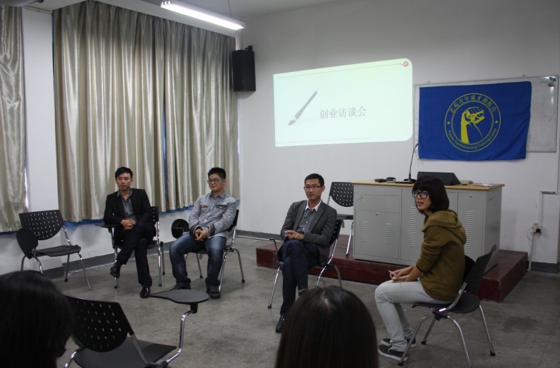 访谈分为两个环节,第一轮是各位受访创业者讲述自己自身创业经历。首先黄海鸥同学讲述了自己从高中毕业创办美术基地到现在进入艺术传媒职业经理人的创业经历,他始终保持积极昂扬的人生态度,不断认识自己、反省自己,并忠告我们在创业中不可盲目,要具备抗压能力,做一个有责任有担当的优秀的人。接着李瑞雪学长以一句名言“万丈红尘三杯酒。千秋伟业一壶茶”展开论述告诫学弟学妹们要珍惜时间,不可沉溺于过去的荣耀,及时当努力,莫等闲,白了少年头;作为艺院青年, 要多读书、听故事、看人生,知识来源于自身的体悟。做好的计划才能有好的行动力。最后,刚刚获得浙江省职业规划大赛创业组第一名的金崇松同学,从自己三次创办公司失败的经历告诫有志向创业的同学,失败并不可怕,只要我们能坚持下去,过了这个坎,才能获得成功。
