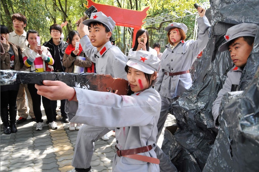 学生会在校本部第一餐厅对面的小广场举行了一场“红色达人”行为艺术展,作为学院纪念建党90周年系列活动的子活动,为党的90诞辰献上了一份特别的礼物。