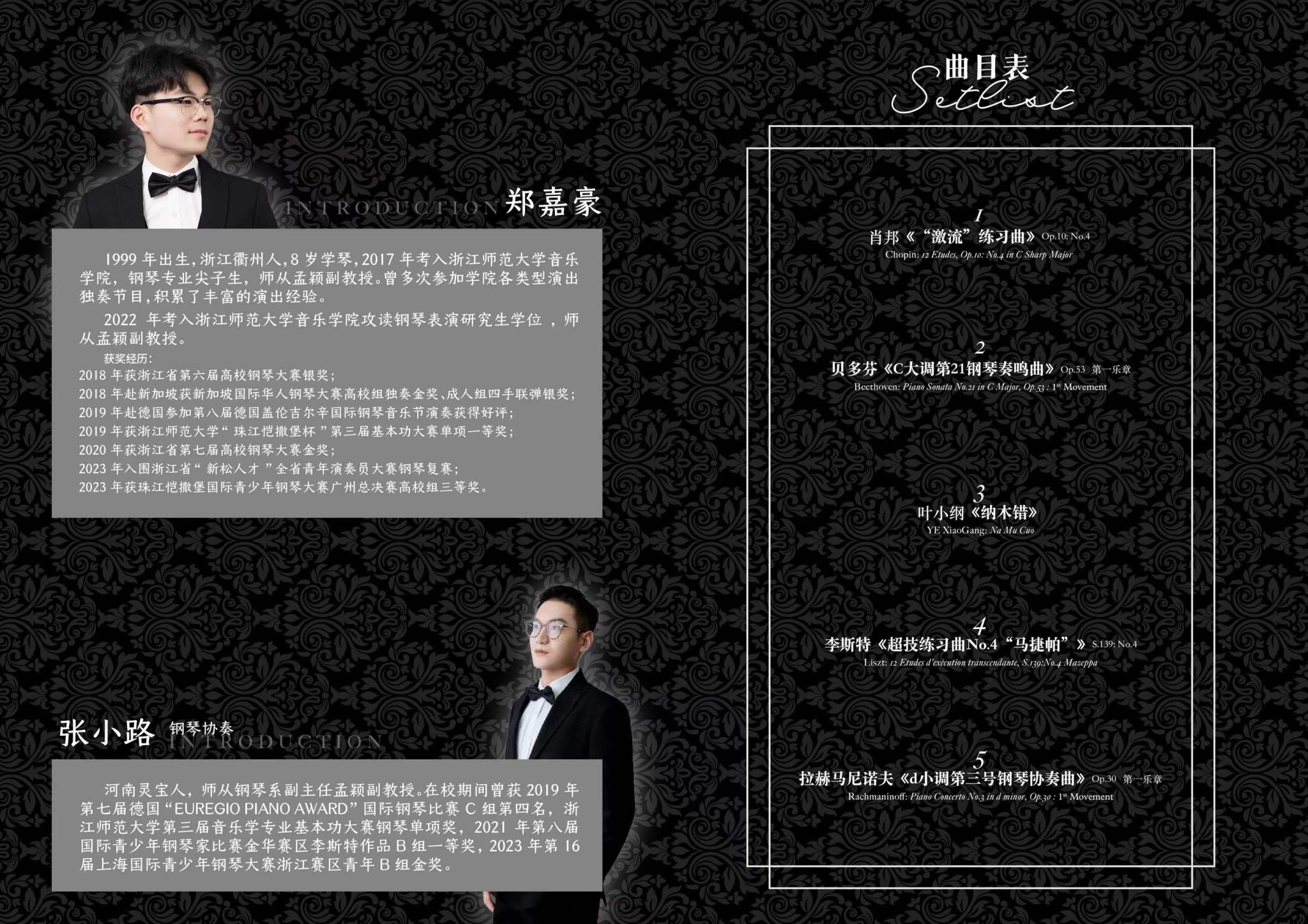 最后郑嘉豪和张小路共同为大家带来了拉赫马尼诺夫的《d小调第三号钢琴协奏曲》,这首协奏曲以其复杂的和声结构和深沉的情感著称,被誉为钢琴文献中的瑰宝之一。两位学员在演奏中默契配合,通过细腻的触键和强烈的情感表达,完美诠释了这部经典之作。在场观众无不被他们精湛的演奏和深刻的音乐理解所折服,掌声经久不息。