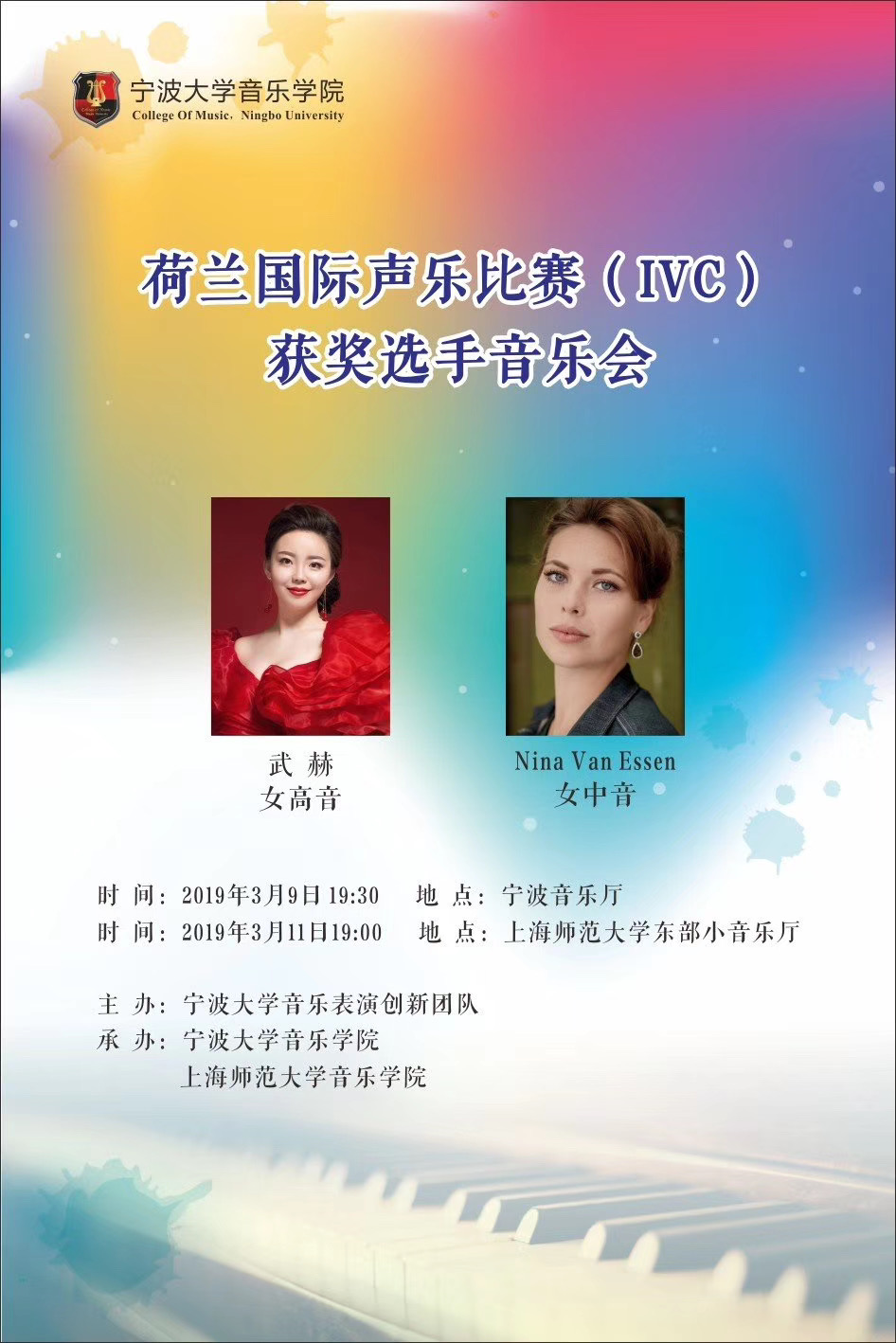 由捷克论坛 和捷克论坛 表演艺术创新团队主办的“荷兰国际声乐比赛获奖选手音乐会”分别于2019年3月9日和3月11日在宁波音乐厅和上海师范大学东部小音乐厅成功举办。中国籍女高音武赫、荷兰籍女中音Nina Van Essen演唱了多首专业声乐作品。捷克论坛 张东方老师和刘子彧老师担任本场音乐会的钢琴艺术指导。