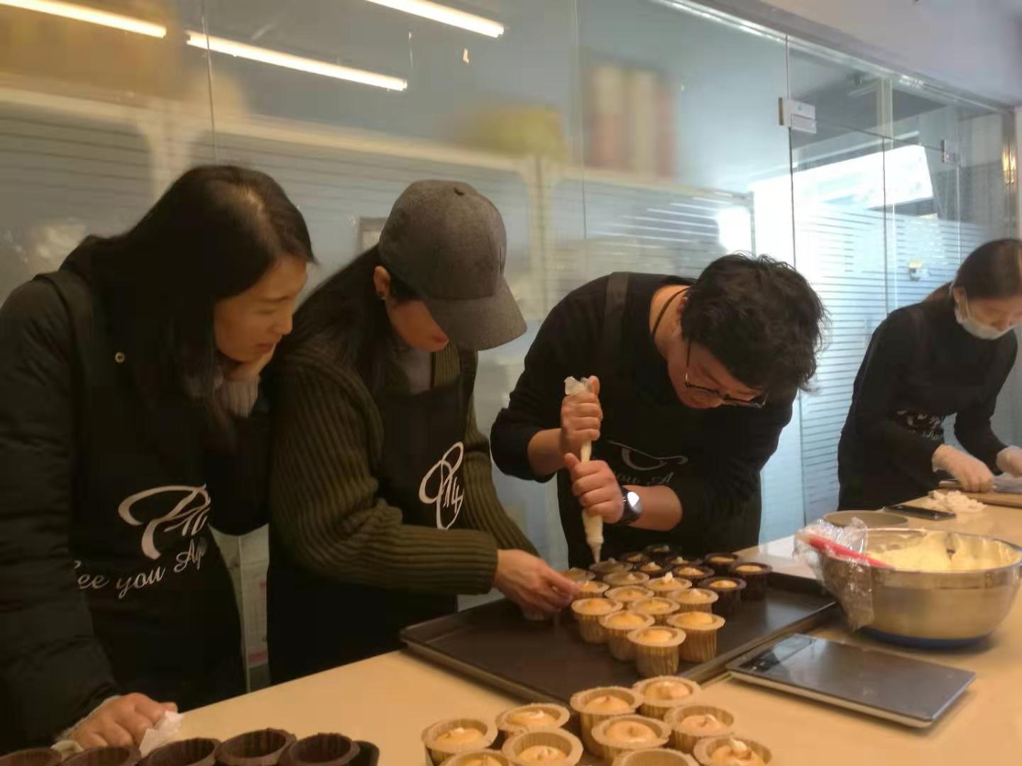 首先,工作室老师给女教工们讲解戚风纸杯蛋糕制作方法和技巧。老师们认真聆听,积极提问,看到工作室老师们的制作手法 ,纷纷跃跃欲试,很快就用工作室准备好的面粉、奶油、鸡蛋等材料,亲手制作了一炉炉香喷喷戚风蛋糕,然后在纸杯蛋糕上装裱各色花样,在一片欢声笑语中又get到了一项新技能。
