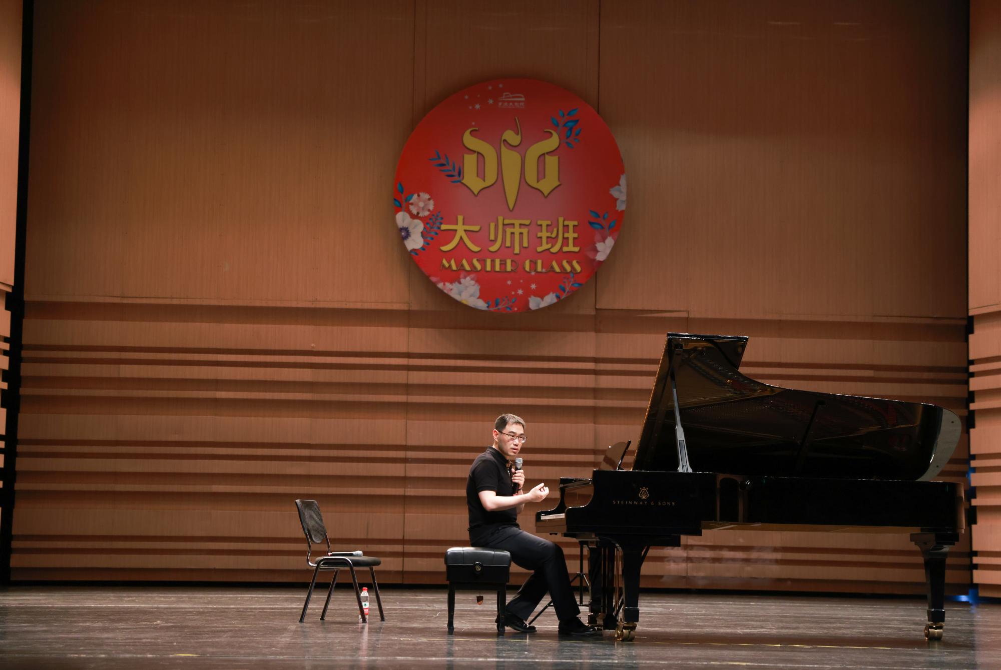 学生俞谦悦(本科二年级)进行演绎,温情的乐音缓缓流淌,令观众们沉浸其中。一曲完毕,张博士由船歌这一体裁的特性进行展开,从节拍律动的规律,乐段分句,到调性转换等多方面一一向观众进行讲解分析。尤其是针对作品中容易出现的乐句分句错误,呼吸与乐句走向不明确的问题,他更是反复强调,并亲自进行了准确示范。
